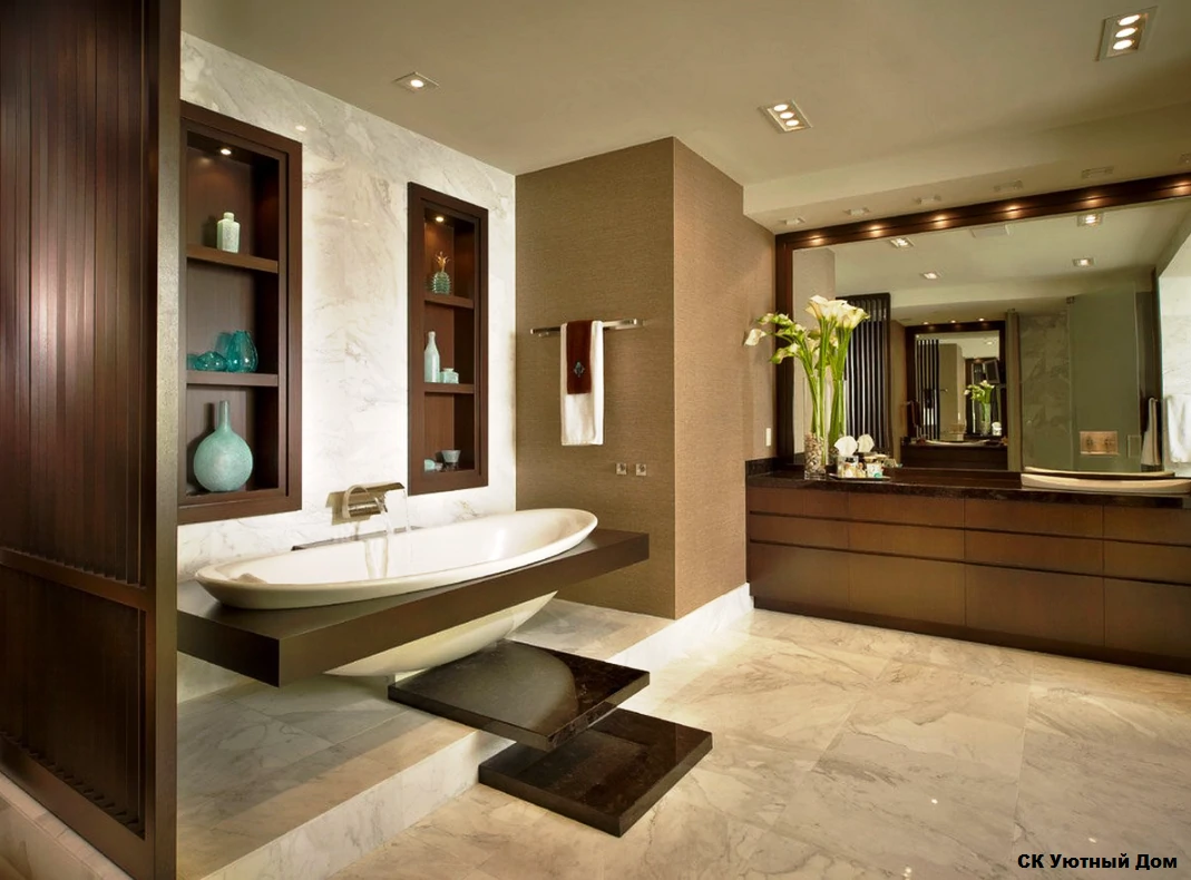 В ванные комнаты большой площади лучше всего укладывать плитку и керамогранит больших размеров (калибров), чтобы она выглядела более равномерно и не создавала ощущения перегруженности., а также не нарушала визуальную симметрию.