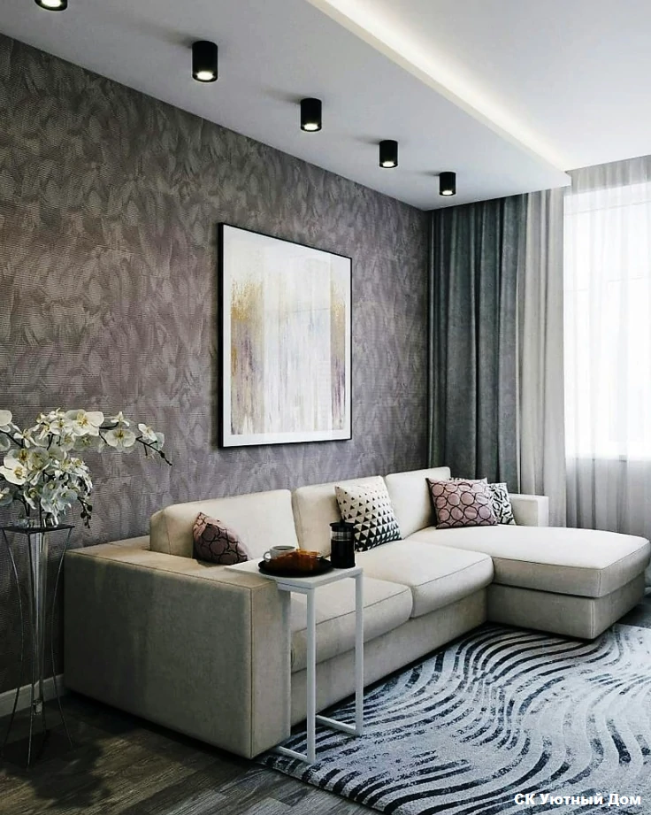 Одним из способов разделения пространства может стать использование разных полов или отделок на стенах. Например, зона спальни может быть выделена темным ламинатом или ковровым покрытием, в то время как гостиная будет иметь светлые отделочные материалы. Такой подход поможет визуально разделить пространство и сделает его более комфортным для использования. Можно использовать глянцевые натяжные потолки, они визуально расширяют пространство.