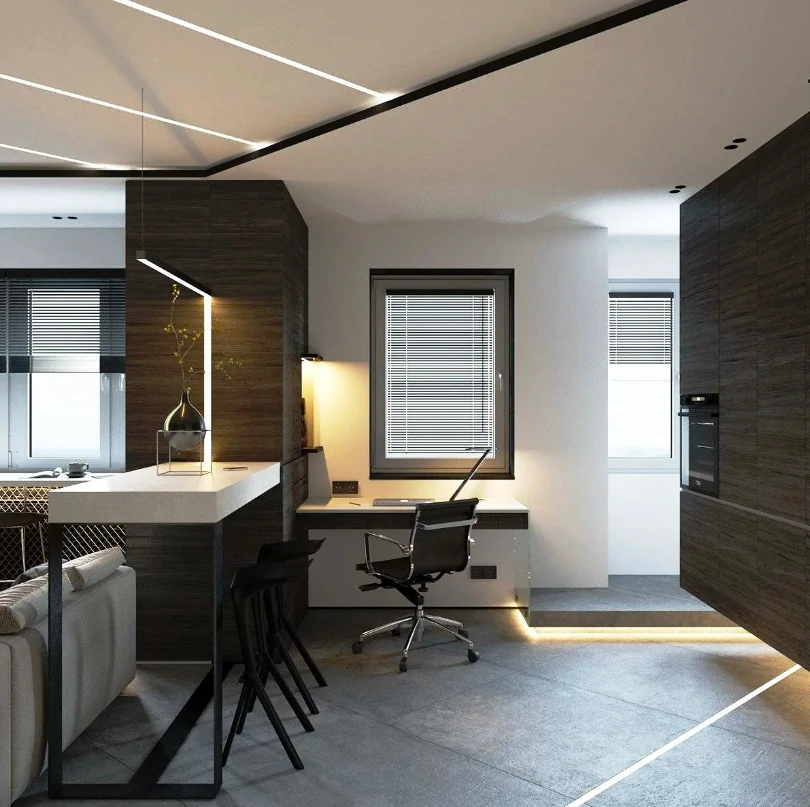Одним из способов разделения пространства может стать использование разных полов или отделок на стенах. Например, зона спальни может быть выделена темным ламинатом или ковровым покрытием, в то время как гостиная будет иметь светлые отделочные материалы. Такой подход поможет визуально разделить пространство и сделает его более комфортным для использования. Можно использовать глянцевые натяжные потолки, они визуально расширяют пространство.