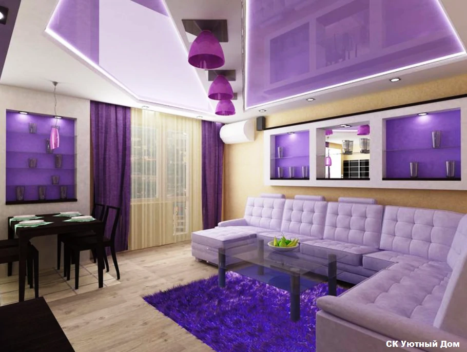 Одним из способов разделения пространства может стать использование разных полов или отделок на стенах. Например, зона спальни может быть выделена темным ламинатом или ковровым покрытием, в то время как гостиная будет иметь светлые отделочные материалы. Такой подход поможет визуально разделить пространство и сделает его более комфортным для использования. Можно использовать глянцевые натяжные потолки, они визуально расширяют пространство.