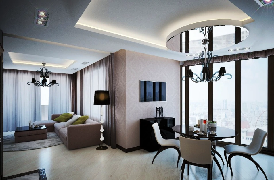 Одним из способов разделения пространства может стать использование разных полов или отделок на стенах. Например, зона спальни может быть выделена темным ламинатом или ковровым покрытием, в то время как гостиная будет иметь светлые отделочные материалы. Такой подход поможет визуально разделить пространство и сделает его более комфортным для использования. Можно использовать глянцевые натяжные потолки, они визуально расширяют пространство.