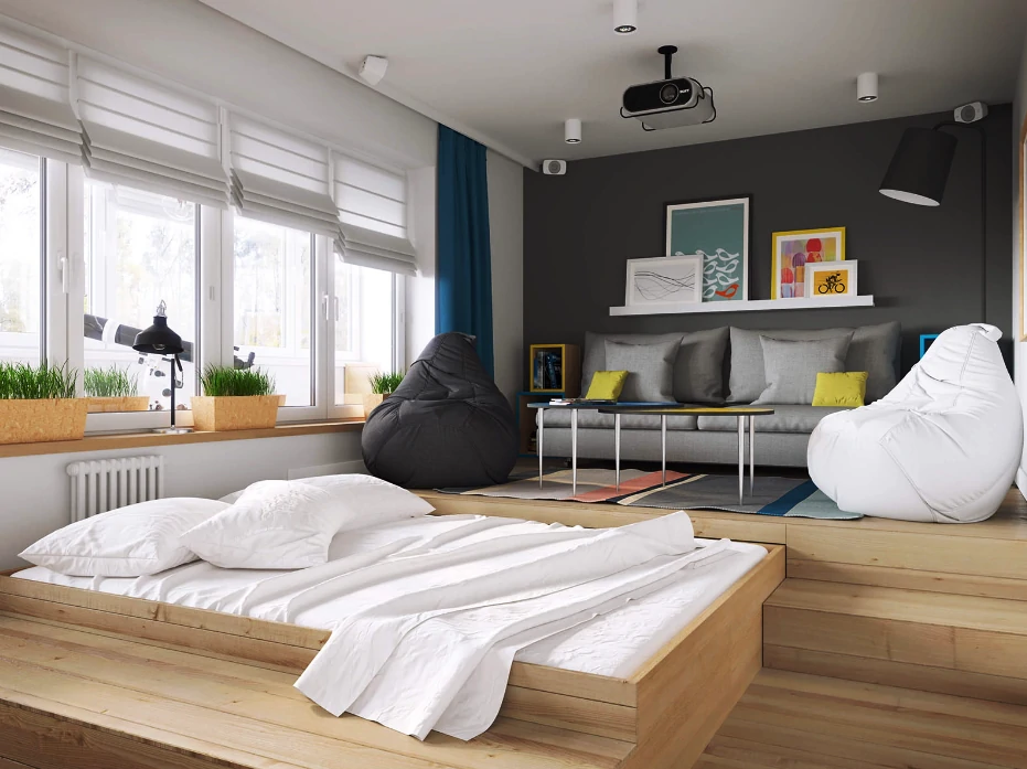 Одним из способов разделения пространства может стать использование разных полов или отделок на стенах. Например, зона спальни может быть выделена темным ламинатом или ковровым покрытием, в то время как гостиная будет иметь светлые отделочные материалы. Такой подход поможет визуально разделить пространство и сделает его более комфортным для использования. Можно использовать глянцевые натяжные потолки, они визуально расширяют пространство.