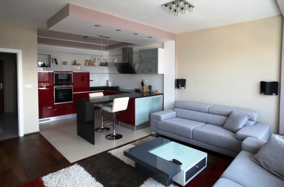 Одним из способов разделения пространства может стать использование разных полов или отделок на стенах. Например, зона спальни может быть выделена темным ламинатом или ковровым покрытием, в то время как гостиная будет иметь светлые отделочные материалы. Такой подход поможет визуально разделить пространство и сделает его более комфортным для использования. Можно использовать глянцевые натяжные потолки, они визуально расширяют пространство.