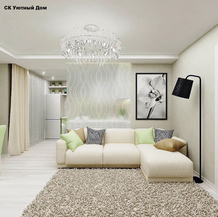 Одним из способов разделения пространства может стать использование разных полов или отделок на стенах. Например, зона спальни может быть выделена темным ламинатом или ковровым покрытием, в то время как гостиная будет иметь светлые отделочные материалы. Такой подход поможет визуально разделить пространство и сделает его более комфортным для использования. Можно использовать глянцевые натяжные потолки, они визуально расширяют пространство.