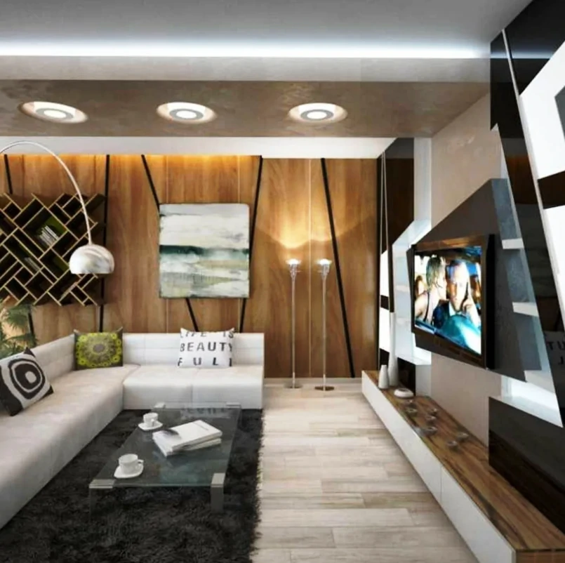 Одним из способов разделения пространства может стать использование разных полов или отделок на стенах. Например, зона спальни может быть выделена темным ламинатом или ковровым покрытием, в то время как гостиная будет иметь светлые отделочные материалы. Такой подход поможет визуально разделить пространство и сделает его более комфортным для использования. Можно использовать глянцевые натяжные потолки, они визуально расширяют пространство.