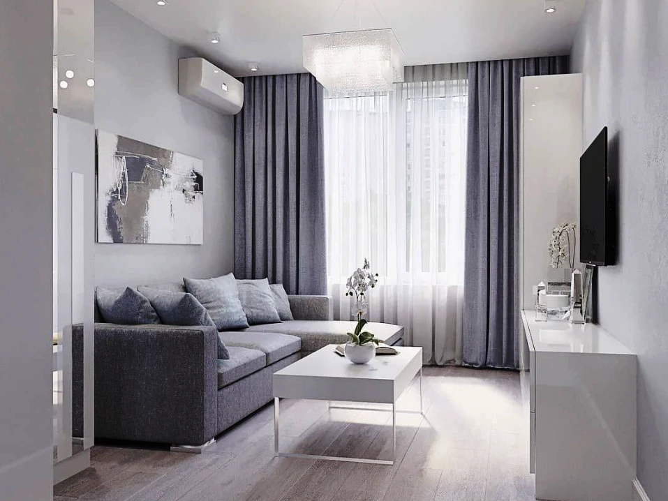 Одним из способов разделения пространства может стать использование разных полов или отделок на стенах. Например, зона спальни может быть выделена темным ламинатом или ковровым покрытием, в то время как гостиная будет иметь светлые отделочные материалы. Такой подход поможет визуально разделить пространство и сделает его более комфортным для использования. Можно использовать глянцевые натяжные потолки, они визуально расширяют пространство.