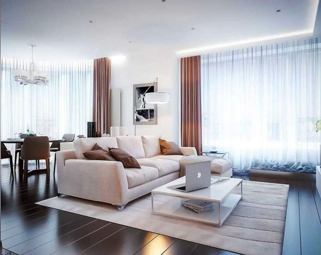 Одним из способов разделения пространства может стать использование разных полов или отделок на стенах. Например, зона спальни может быть выделена темным ламинатом или ковровым покрытием, в то время как гостиная будет иметь светлые отделочные материалы. Такой подход поможет визуально разделить пространство и сделает его более комфортным для использования. Можно использовать глянцевые натяжные потолки, они визуально расширяют пространство.