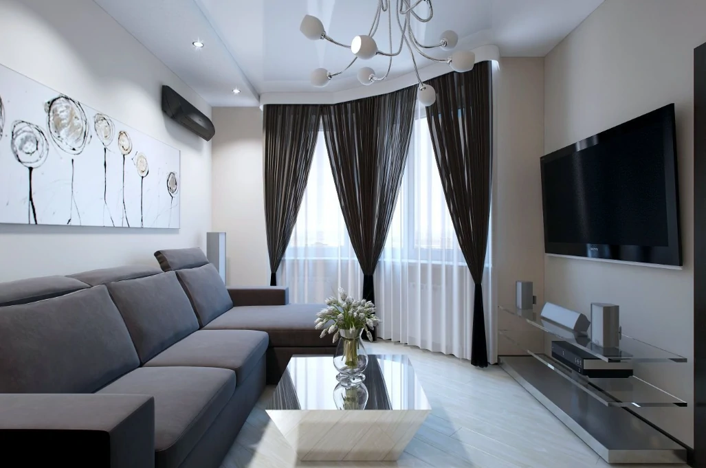 Одним из способов разделения пространства может стать использование разных полов или отделок на стенах. Например, зона спальни может быть выделена темным ламинатом или ковровым покрытием, в то время как гостиная будет иметь светлые отделочные материалы. Такой подход поможет визуально разделить пространство и сделает его более комфортным для использования. Можно использовать глянцевые натяжные потолки, они визуально расширяют пространство.