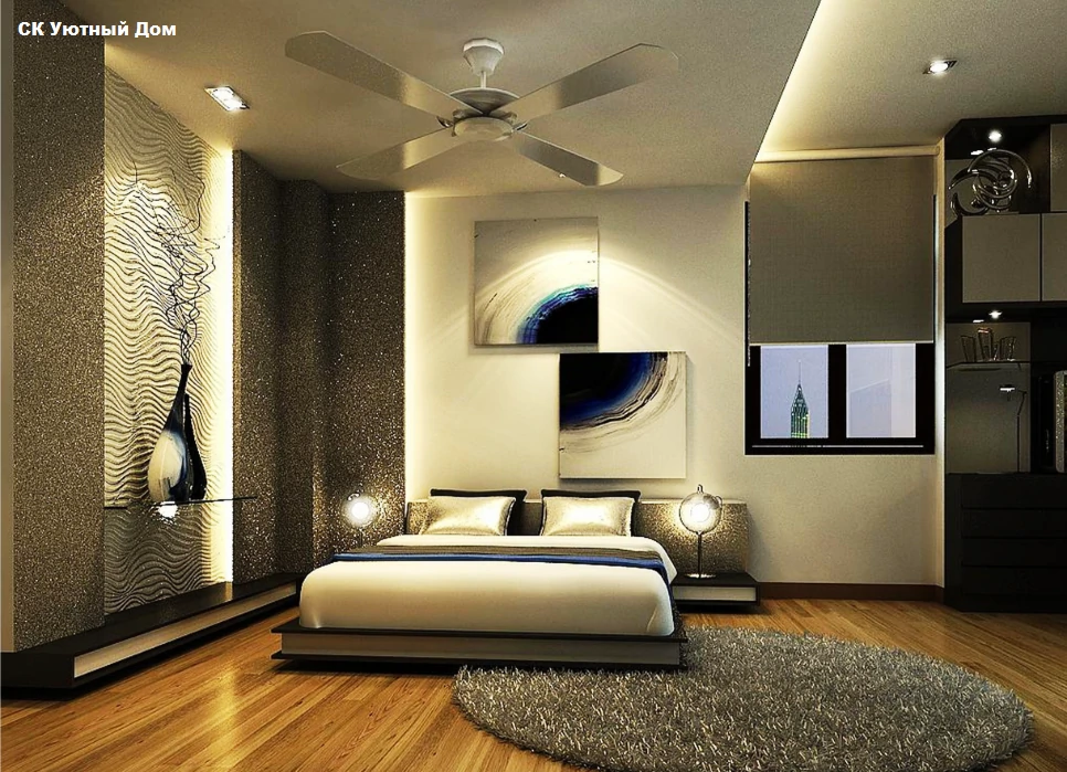 Одним из способов разделения пространства может стать использование разных полов или отделок на стенах. Например, зона спальни может быть выделена темным ламинатом или ковровым покрытием, в то время как гостиная будет иметь светлые отделочные материалы. Такой подход поможет визуально разделить пространство и сделает его более комфортным для использования. Можно использовать глянцевые натяжные потолки, они визуально расширяют пространство.