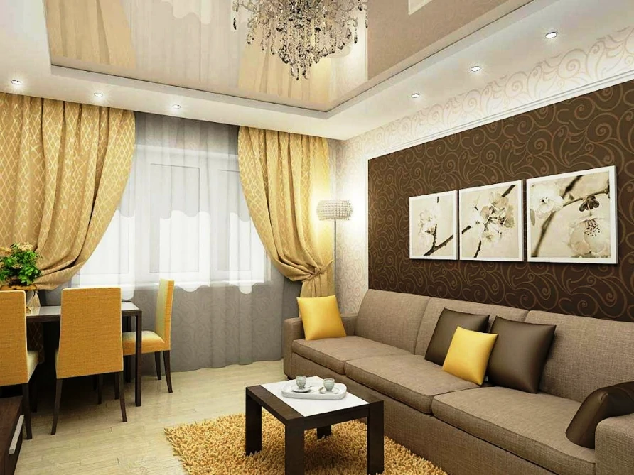 Одним из способов разделения пространства может стать использование разных полов или отделок на стенах. Например, зона спальни может быть выделена темным ламинатом или ковровым покрытием, в то время как гостиная будет иметь светлые отделочные материалы. Такой подход поможет визуально разделить пространство и сделает его более комфортным для использования. Можно использовать глянцевые натяжные потолки, они визуально расширяют пространство.