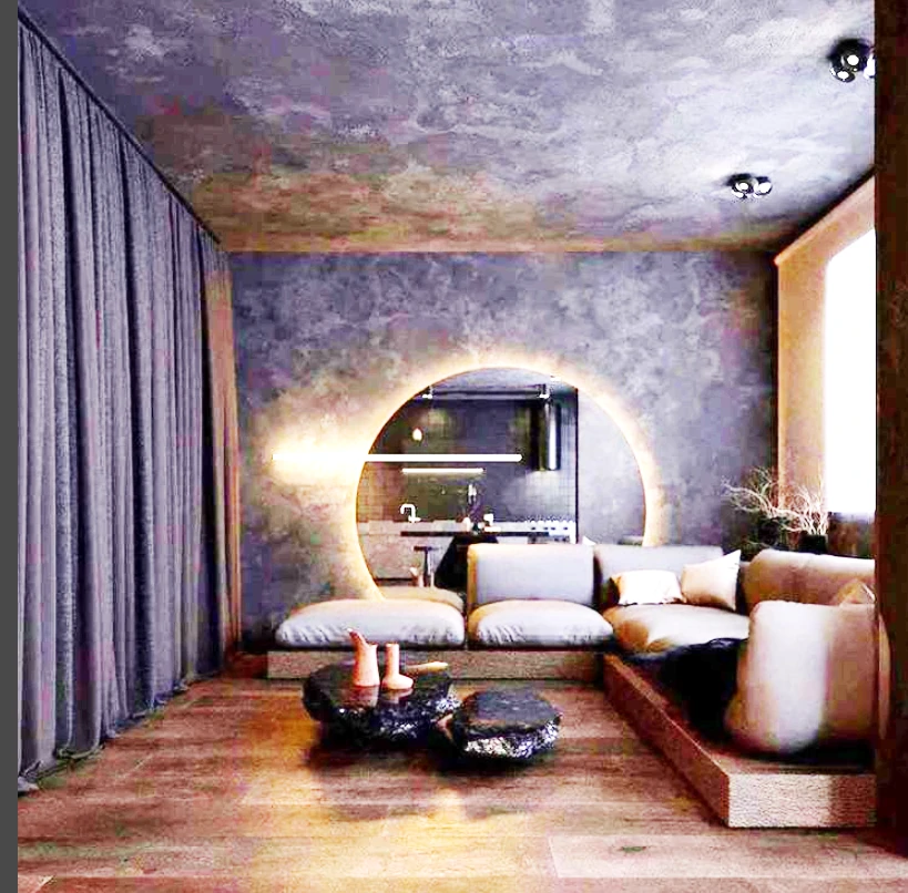 Одним из способов разделения пространства может стать использование разных полов или отделок на стенах. Например, зона спальни может быть выделена темным ламинатом или ковровым покрытием, в то время как гостиная будет иметь светлые отделочные материалы. Такой подход поможет визуально разделить пространство и сделает его более комфортным для использования. Можно использовать глянцевые натяжные потолки, они визуально расширяют пространство.