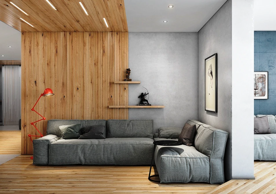 Одним из способов разделения пространства может стать использование разных полов или отделок на стенах. Например, зона спальни может быть выделена темным ламинатом или ковровым покрытием, в то время как гостиная будет иметь светлые отделочные материалы. Такой подход поможет визуально разделить пространство и сделает его более комфортным для использования. Можно использовать глянцевые натяжные потолки, они визуально расширяют пространство.