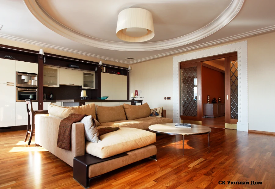 Одним из способов разделения пространства может стать использование разных полов или отделок на стенах. Например, зона спальни может быть выделена темным ламинатом или ковровым покрытием, в то время как гостиная будет иметь светлые отделочные материалы. Такой подход поможет визуально разделить пространство и сделает его более комфортным для использования. Можно использовать глянцевые натяжные потолки, они визуально расширяют пространство.