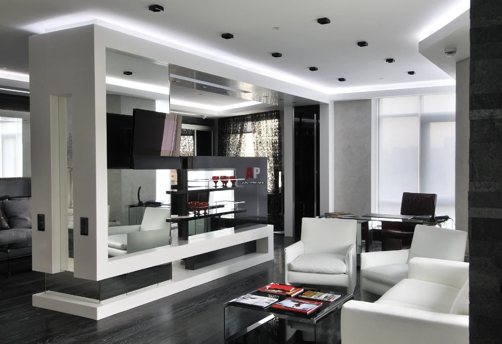 Одним из способов разделения пространства может стать использование разных полов или отделок на стенах. Например, зона спальни может быть выделена темным ламинатом или ковровым покрытием, в то время как гостиная будет иметь светлые отделочные материалы. Такой подход поможет визуально разделить пространство и сделает его более комфортным для использования. Можно использовать глянцевые натяжные потолки, они визуально расширяют пространство.