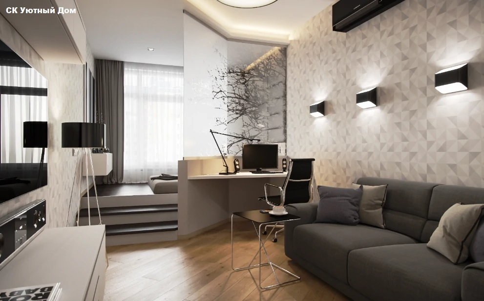 Одним из способов разделения пространства может стать использование разных полов или отделок на стенах. Например, зона спальни может быть выделена темным ламинатом или ковровым покрытием, в то время как гостиная будет иметь светлые отделочные материалы. Такой подход поможет визуально разделить пространство и сделает его более комфортным для использования. Можно использовать глянцевые натяжные потолки, они визуально расширяют пространство.