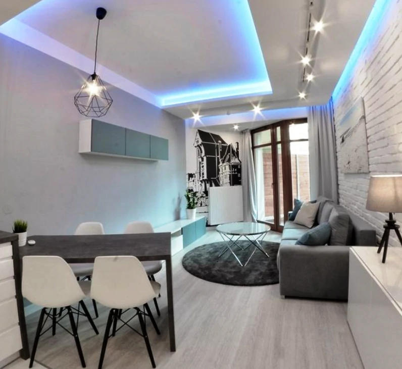 Одним из способов разделения пространства может стать использование разных полов или отделок на стенах. Например, зона спальни может быть выделена темным ламинатом или ковровым покрытием, в то время как гостиная будет иметь светлые отделочные материалы. Такой подход поможет визуально разделить пространство и сделает его более комфортным для использования. Можно использовать глянцевые натяжные потолки, они визуально расширяют пространство.
