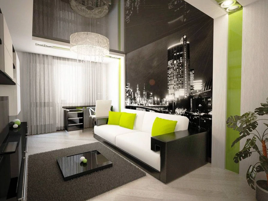 Одним из способов разделения пространства может стать использование разных полов или отделок на стенах. Например, зона спальни может быть выделена темным ламинатом или ковровым покрытием, в то время как гостиная будет иметь светлые отделочные материалы. Такой подход поможет визуально разделить пространство и сделает его более комфортным для использования. Можно использовать глянцевые натяжные потолки, они визуально расширяют пространство.