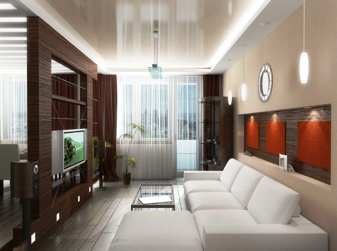 Одним из способов разделения пространства может стать использование разных полов или отделок на стенах. Например, зона спальни может быть выделена темным ламинатом или ковровым покрытием, в то время как гостиная будет иметь светлые отделочные материалы. Такой подход поможет визуально разделить пространство и сделает его более комфортным для использования. Можно использовать глянцевые натяжные потолки, они визуально расширяют пространство.
