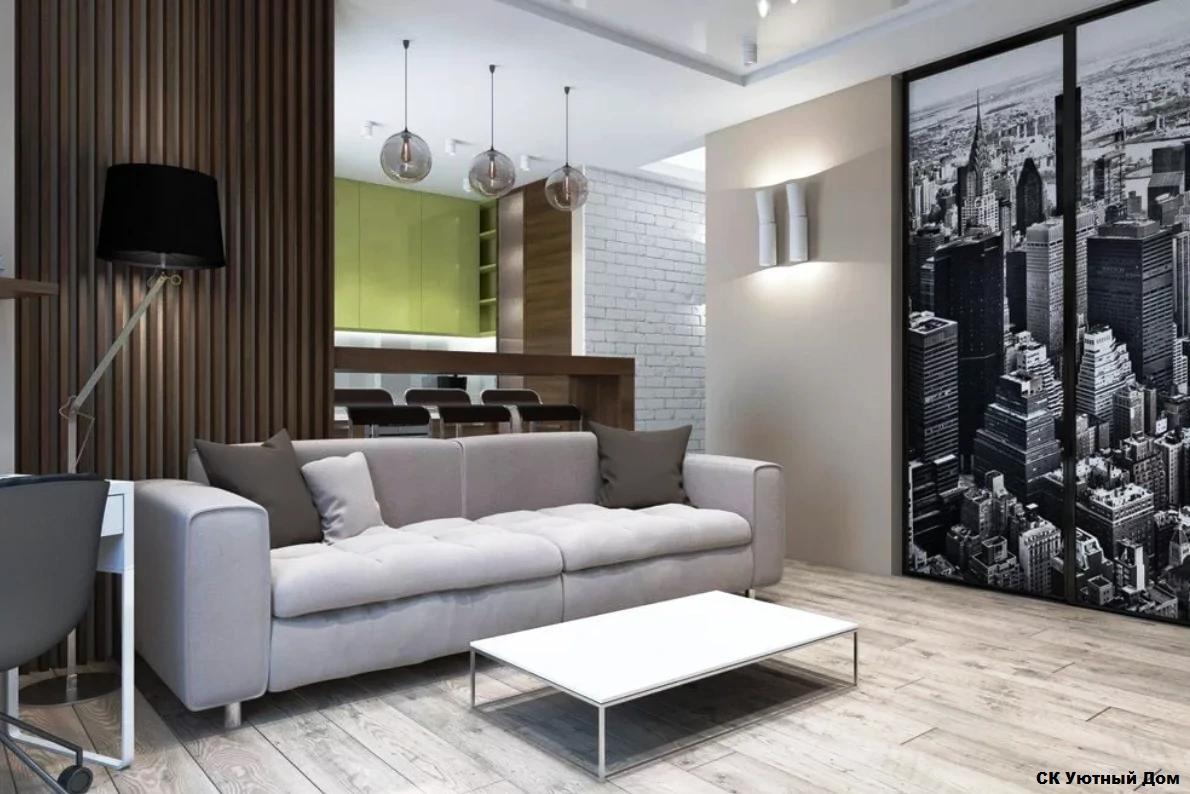 Одним из способов разделения пространства может стать использование разных полов или отделок на стенах. Например, зона спальни может быть выделена темным ламинатом или ковровым покрытием, в то время как гостиная будет иметь светлые отделочные материалы. Такой подход поможет визуально разделить пространство и сделает его более комфортным для использования. Можно использовать глянцевые натяжные потолки, они визуально расширяют пространство.