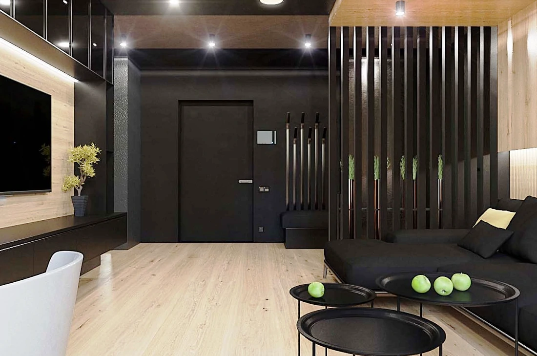 Одним из способов разделения пространства может стать использование разных полов или отделок на стенах. Например, зона спальни может быть выделена темным ламинатом или ковровым покрытием, в то время как гостиная будет иметь светлые отделочные материалы. Такой подход поможет визуально разделить пространство и сделает его более комфортным для использования. Можно использовать глянцевые натяжные потолки, они визуально расширяют пространство.
