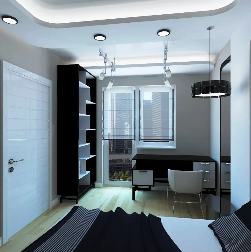 Одним из способов разделения пространства может стать использование разных полов или отделок на стенах. Например, зона спальни может быть выделена темным ламинатом или ковровым покрытием, в то время как гостиная будет иметь светлые отделочные материалы. Такой подход поможет визуально разделить пространство и сделает его более комфортным для использования. Можно использовать глянцевые натяжные потолки, они визуально расширяют пространство.