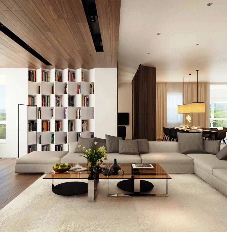 Одним из способов разделения пространства может стать использование разных полов или отделок на стенах. Например, зона спальни может быть выделена темным ламинатом или ковровым покрытием, в то время как гостиная будет иметь светлые отделочные материалы. Такой подход поможет визуально разделить пространство и сделает его более комфортным для использования. Можно использовать глянцевые натяжные потолки, они визуально расширяют пространство.