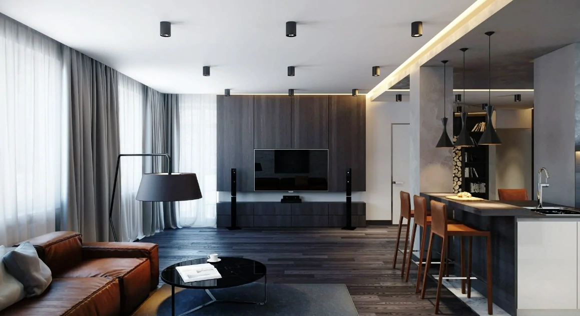 Одним из способов разделения пространства может стать использование разных полов или отделок на стенах. Например, зона спальни может быть выделена темным ламинатом или ковровым покрытием, в то время как гостиная будет иметь светлые отделочные материалы. Такой подход поможет визуально разделить пространство и сделает его более комфортным для использования. Можно использовать глянцевые натяжные потолки, они визуально расширяют пространство.