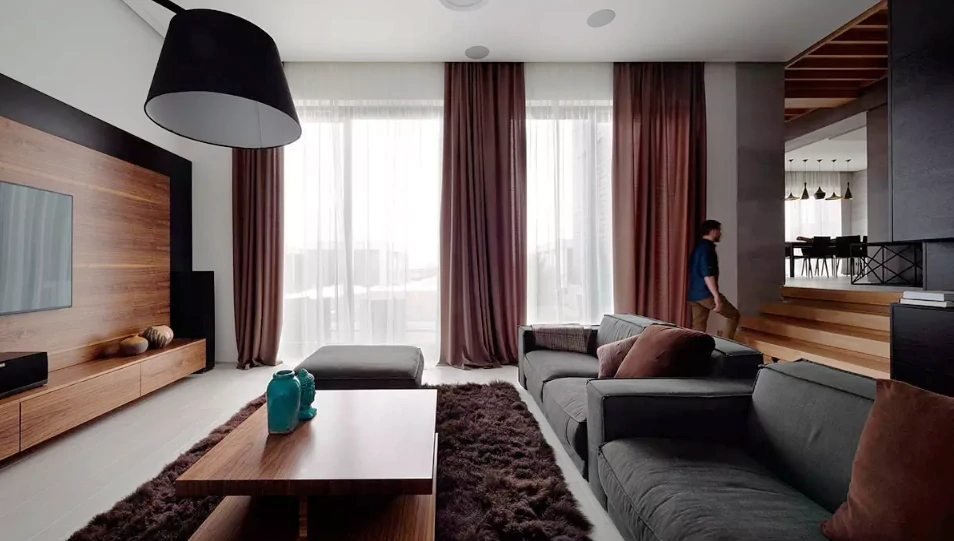 Одним из способов разделения пространства может стать использование разных полов или отделок на стенах. Например, зона спальни может быть выделена темным ламинатом или ковровым покрытием, в то время как гостиная будет иметь светлые отделочные материалы. Такой подход поможет визуально разделить пространство и сделает его более комфортным для использования. Можно использовать глянцевые натяжные потолки, они визуально расширяют пространство.