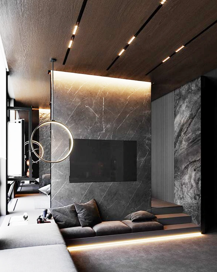 Одним из способов разделения пространства может стать использование разных полов или отделок на стенах. Например, зона спальни может быть выделена темным ламинатом или ковровым покрытием, в то время как гостиная будет иметь светлые отделочные материалы. Такой подход поможет визуально разделить пространство и сделает его более комфортным для использования. Можно использовать глянцевые натяжные потолки, они визуально расширяют пространство.