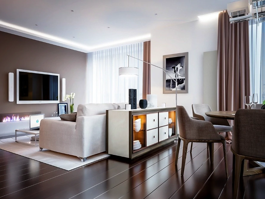 Одним из способов разделения пространства может стать использование разных полов или отделок на стенах. Например, зона спальни может быть выделена темным ламинатом или ковровым покрытием, в то время как гостиная будет иметь светлые отделочные материалы. Такой подход поможет визуально разделить пространство и сделает его более комфортным для использования. Можно использовать глянцевые натяжные потолки, они визуально расширяют пространство.