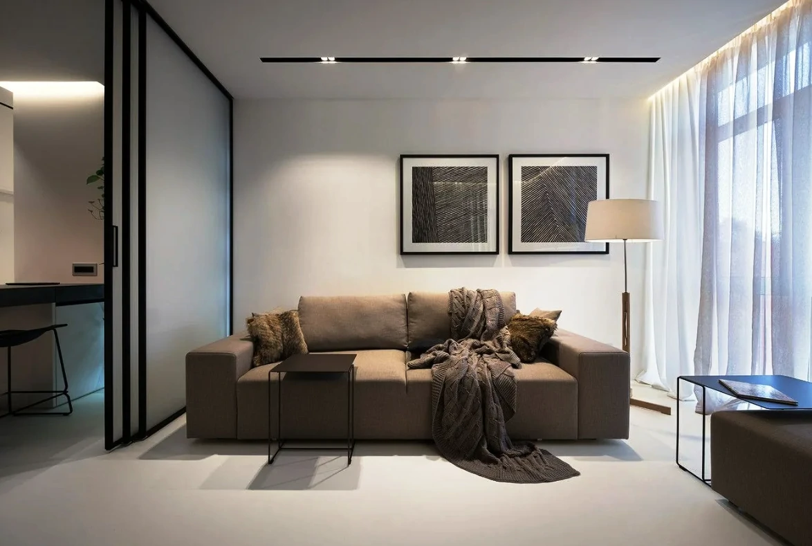 Одним из способов разделения пространства может стать использование разных полов или отделок на стенах. Например, зона спальни может быть выделена темным ламинатом или ковровым покрытием, в то время как гостиная будет иметь светлые отделочные материалы. Такой подход поможет визуально разделить пространство и сделает его более комфортным для использования. Можно использовать глянцевые натяжные потолки, они визуально расширяют пространство.