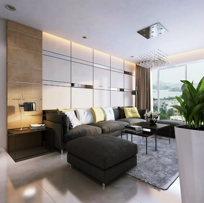 Одним из способов разделения пространства может стать использование разных полов или отделок на стенах. Например, зона спальни может быть выделена темным ламинатом или ковровым покрытием, в то время как гостиная будет иметь светлые отделочные материалы. Такой подход поможет визуально разделить пространство и сделает его более комфортным для использования. Можно использовать глянцевые натяжные потолки, они визуально расширяют пространство.