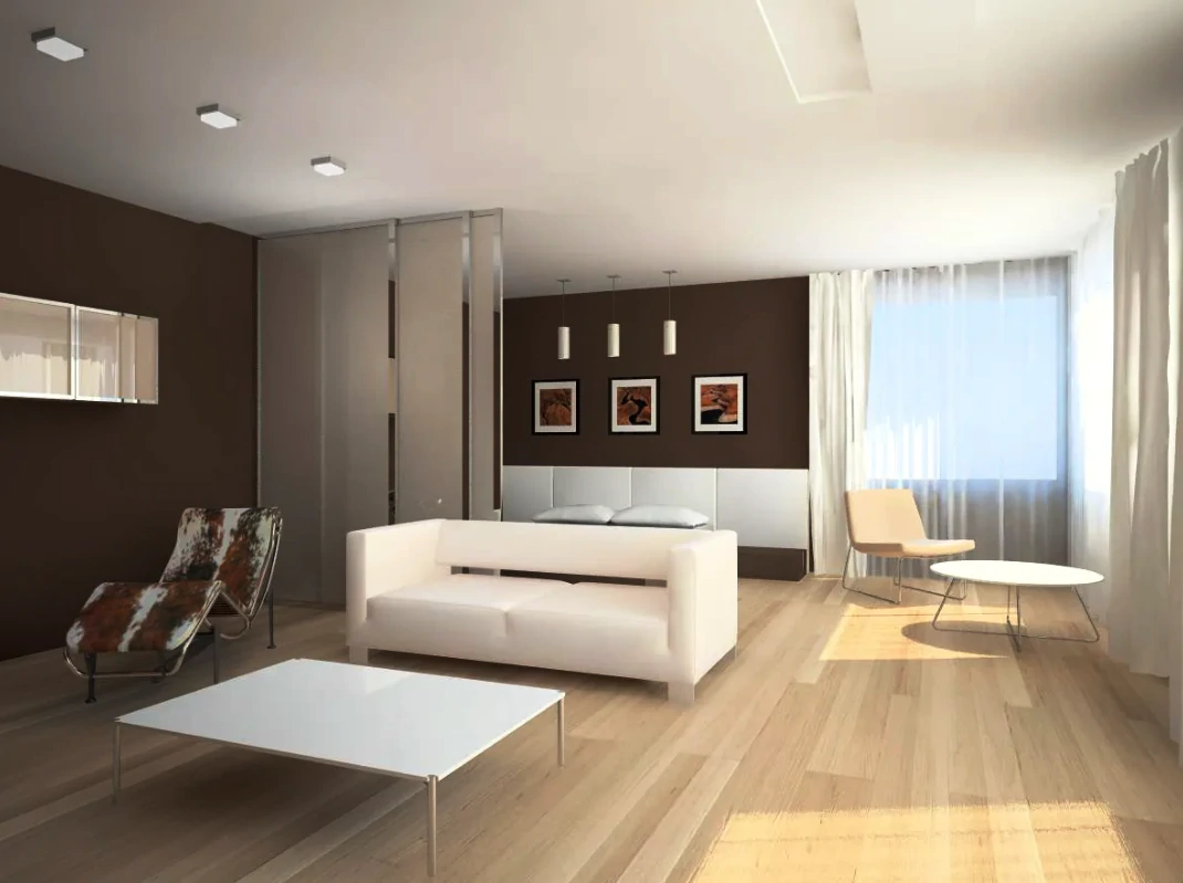 Одним из способов разделения пространства может стать использование разных полов или отделок на стенах. Например, зона спальни может быть выделена темным ламинатом или ковровым покрытием, в то время как гостиная будет иметь светлые отделочные материалы. Такой подход поможет визуально разделить пространство и сделает его более комфортным для использования. Можно использовать глянцевые натяжные потолки, они визуально расширяют пространство.