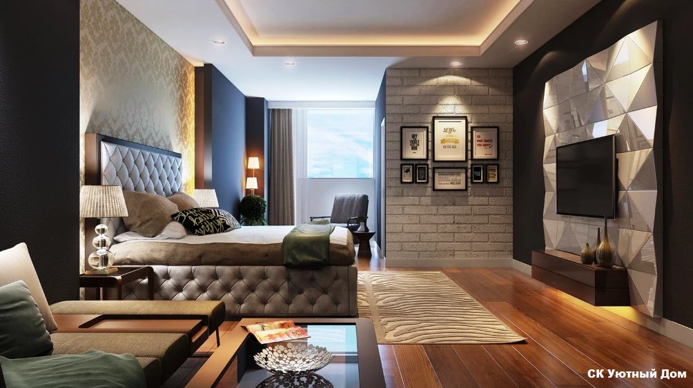 Одним из способов разделения пространства может стать использование разных полов или отделок на стенах. Например, зона спальни может быть выделена темным ламинатом или ковровым покрытием, в то время как гостиная будет иметь светлые отделочные материалы. Такой подход поможет визуально разделить пространство и сделает его более комфортным для использования. Можно использовать глянцевые натяжные потолки, они визуально расширяют пространство.