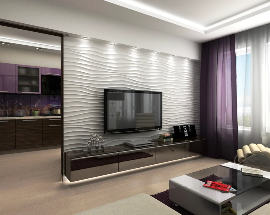 Одним из способов разделения пространства может стать использование разных полов или отделок на стенах. Например, зона спальни может быть выделена темным ламинатом или ковровым покрытием, в то время как гостиная будет иметь светлые отделочные материалы. Такой подход поможет визуально разделить пространство и сделает его более комфортным для использования. Можно использовать глянцевые натяжные потолки, они визуально расширяют пространство.