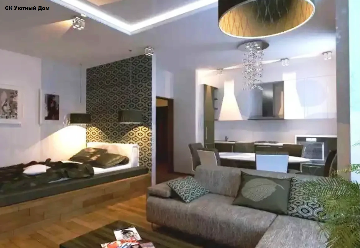 Одним из способов разделения пространства может стать использование разных полов или отделок на стенах. Например, зона спальни может быть выделена темным ламинатом или ковровым покрытием, в то время как гостиная будет иметь светлые отделочные материалы. Такой подход поможет визуально разделить пространство и сделает его более комфортным для использования. Можно использовать глянцевые натяжные потолки, они визуально расширяют пространство.