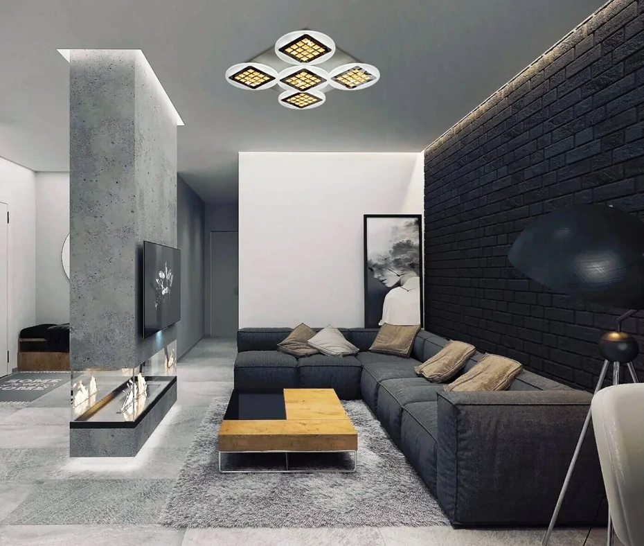 Одним из способов разделения пространства может стать использование разных полов или отделок на стенах. Например, зона спальни может быть выделена темным ламинатом или ковровым покрытием, в то время как гостиная будет иметь светлые отделочные материалы. Такой подход поможет визуально разделить пространство и сделает его более комфортным для использования. Можно использовать глянцевые натяжные потолки, они визуально расширяют пространство.