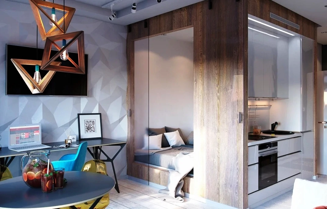Одним из способов разделения пространства может стать использование разных полов или отделок на стенах. Например, зона спальни может быть выделена темным ламинатом или ковровым покрытием, в то время как гостиная будет иметь светлые отделочные материалы. Такой подход поможет визуально разделить пространство и сделает его более комфортным для использования. Можно использовать глянцевые натяжные потолки, они визуально расширяют пространство.