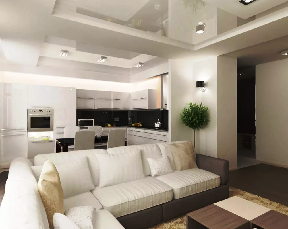 Одним из способов разделения пространства может стать использование разных полов или отделок на стенах. Например, зона спальни может быть выделена темным ламинатом или ковровым покрытием, в то время как гостиная будет иметь светлые отделочные материалы. Такой подход поможет визуально разделить пространство и сделает его более комфортным для использования. Можно использовать глянцевые натяжные потолки, они визуально расширяют пространство.