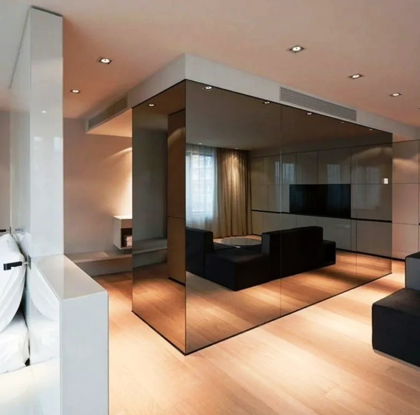 Одним из способов разделения пространства может стать использование разных полов или отделок на стенах. Например, зона спальни может быть выделена темным ламинатом или ковровым покрытием, в то время как гостиная будет иметь светлые отделочные материалы. Такой подход поможет визуально разделить пространство и сделает его более комфортным для использования. Можно использовать глянцевые натяжные потолки, они визуально расширяют пространство.