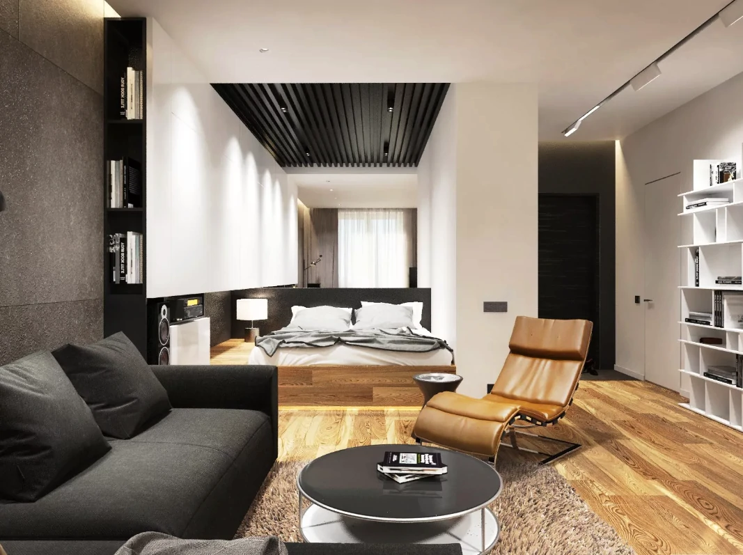 Одним из способов разделения пространства может стать использование разных полов или отделок на стенах. Например, зона спальни может быть выделена темным ламинатом или ковровым покрытием, в то время как гостиная будет иметь светлые отделочные материалы. Такой подход поможет визуально разделить пространство и сделает его более комфортным для использования. Можно использовать глянцевые натяжные потолки, они визуально расширяют пространство.
