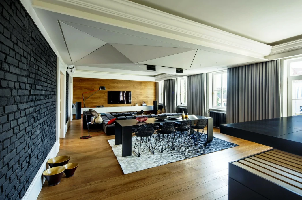 Одним из способов разделения пространства может стать использование разных полов или отделок на стенах. Например, зона спальни может быть выделена темным ламинатом или ковровым покрытием, в то время как гостиная будет иметь светлые отделочные материалы. Такой подход поможет визуально разделить пространство и сделает его более комфортным для использования. Можно использовать глянцевые натяжные потолки, они визуально расширяют пространство.