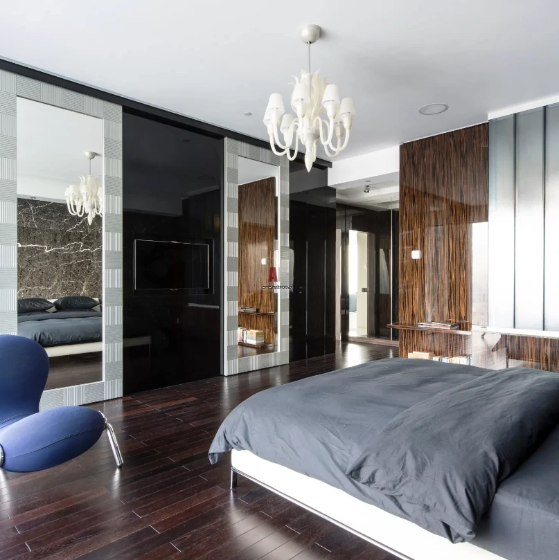 Одним из способов разделения пространства может стать использование разных полов или отделок на стенах. Например, зона спальни может быть выделена темным ламинатом или ковровым покрытием, в то время как гостиная будет иметь светлые отделочные материалы. Такой подход поможет визуально разделить пространство и сделает его более комфортным для использования. Можно использовать глянцевые натяжные потолки, они визуально расширяют пространство.