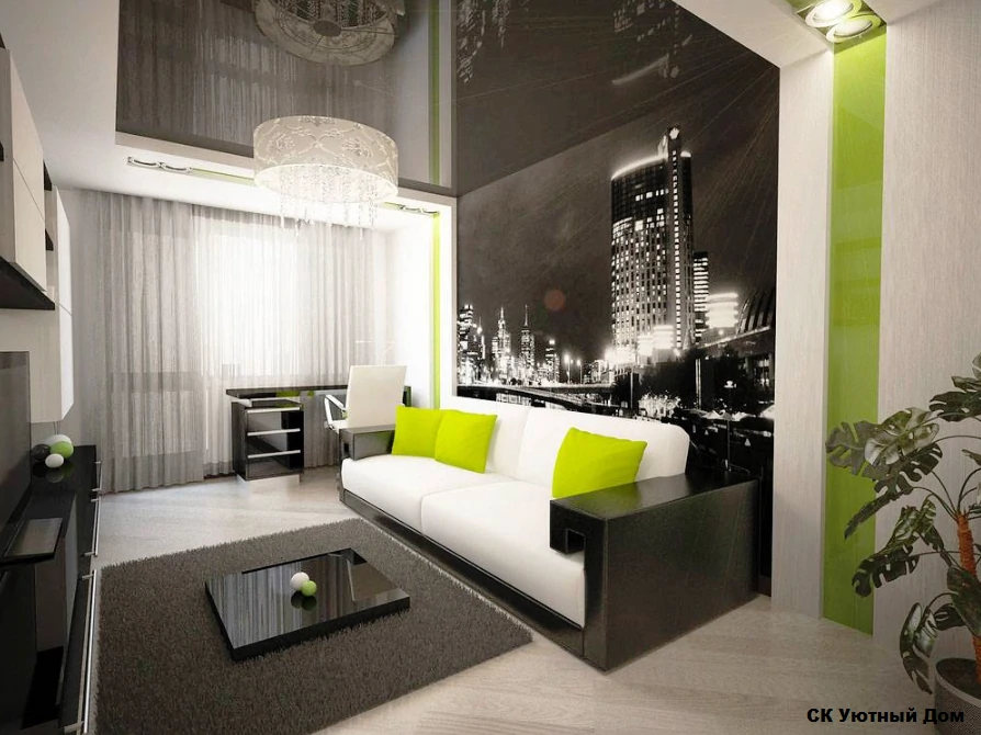 Одним из способов разделения пространства может стать использование разных полов или отделок на стенах. Например, зона спальни может быть выделена темным ламинатом или ковровым покрытием, в то время как гостиная будет иметь светлые отделочные материалы. Такой подход поможет визуально разделить пространство и сделает его более комфортным для использования. Можно использовать глянцевые натяжные потолки, они визуально расширяют пространство.