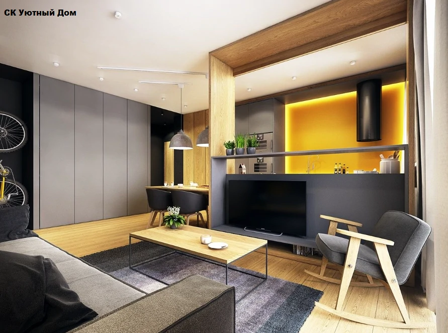 Одним из способов разделения пространства может стать использование разных полов или отделок на стенах. Например, зона спальни может быть выделена темным ламинатом или ковровым покрытием, в то время как гостиная будет иметь светлые отделочные материалы. Такой подход поможет визуально разделить пространство и сделает его более комфортным для использования. Можно использовать глянцевые натяжные потолки, они визуально расширяют пространство.