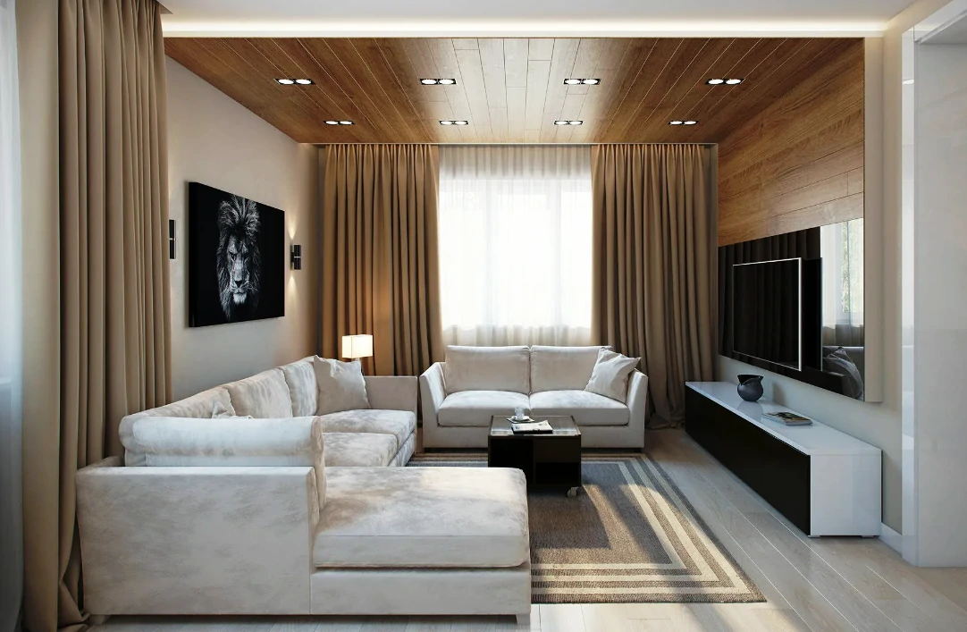 Одним из способов разделения пространства может стать использование разных полов или отделок на стенах. Например, зона спальни может быть выделена темным ламинатом или ковровым покрытием, в то время как гостиная будет иметь светлые отделочные материалы. Такой подход поможет визуально разделить пространство и сделает его более комфортным для использования. Можно использовать глянцевые натяжные потолки, они визуально расширяют пространство.