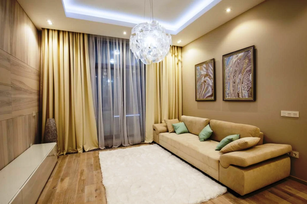 Одним из способов разделения пространства может стать использование разных полов или отделок на стенах. Например, зона спальни может быть выделена темным ламинатом или ковровым покрытием, в то время как гостиная будет иметь светлые отделочные материалы. Такой подход поможет визуально разделить пространство и сделает его более комфортным для использования. Можно использовать глянцевые натяжные потолки, они визуально расширяют пространство.