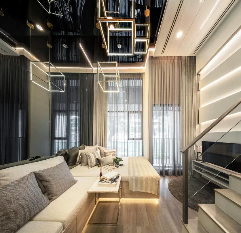 Одним из способов разделения пространства может стать использование разных полов или отделок на стенах. Например, зона спальни может быть выделена темным ламинатом или ковровым покрытием, в то время как гостиная будет иметь светлые отделочные материалы. Такой подход поможет визуально разделить пространство и сделает его более комфортным для использования. Можно использовать глянцевые натяжные потолки, они визуально расширяют пространство.