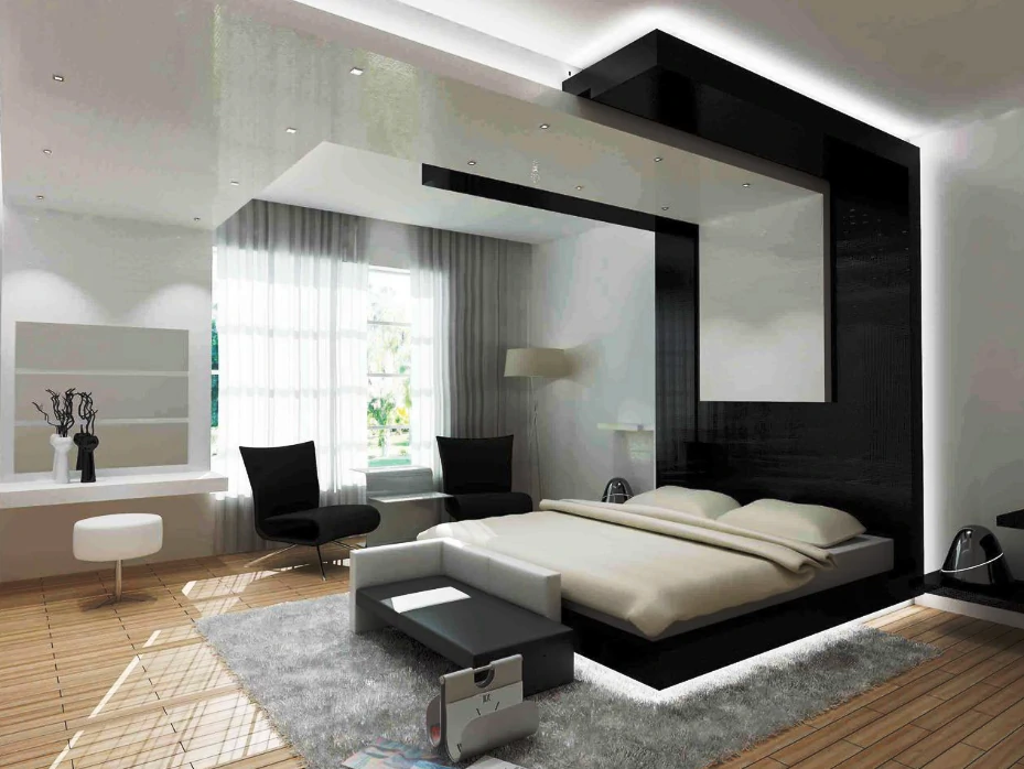 Одним из способов разделения пространства может стать использование разных полов или отделок на стенах. Например, зона спальни может быть выделена темным ламинатом или ковровым покрытием, в то время как гостиная будет иметь светлые отделочные материалы. Такой подход поможет визуально разделить пространство и сделает его более комфортным для использования. Можно использовать глянцевые натяжные потолки, они визуально расширяют пространство.