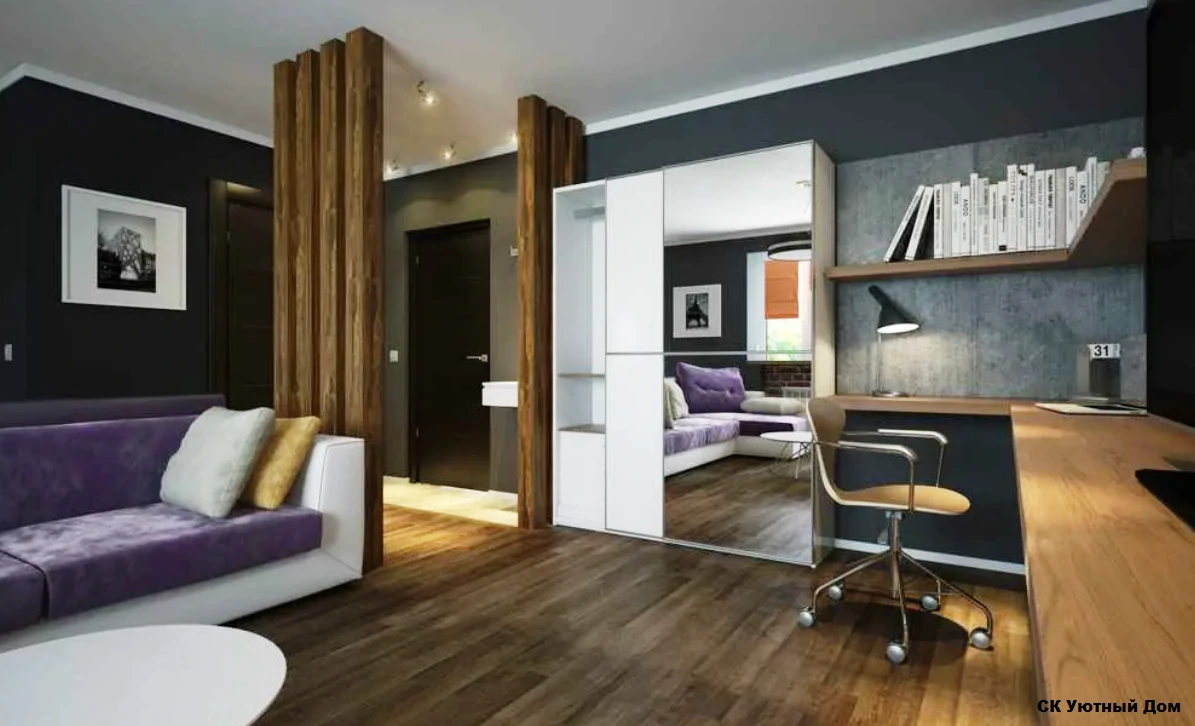 Одним из способов разделения пространства может стать использование разных полов или отделок на стенах. Например, зона спальни может быть выделена темным ламинатом или ковровым покрытием, в то время как гостиная будет иметь светлые отделочные материалы. Такой подход поможет визуально разделить пространство и сделает его более комфортным для использования. Можно использовать глянцевые натяжные потолки, они визуально расширяют пространство.